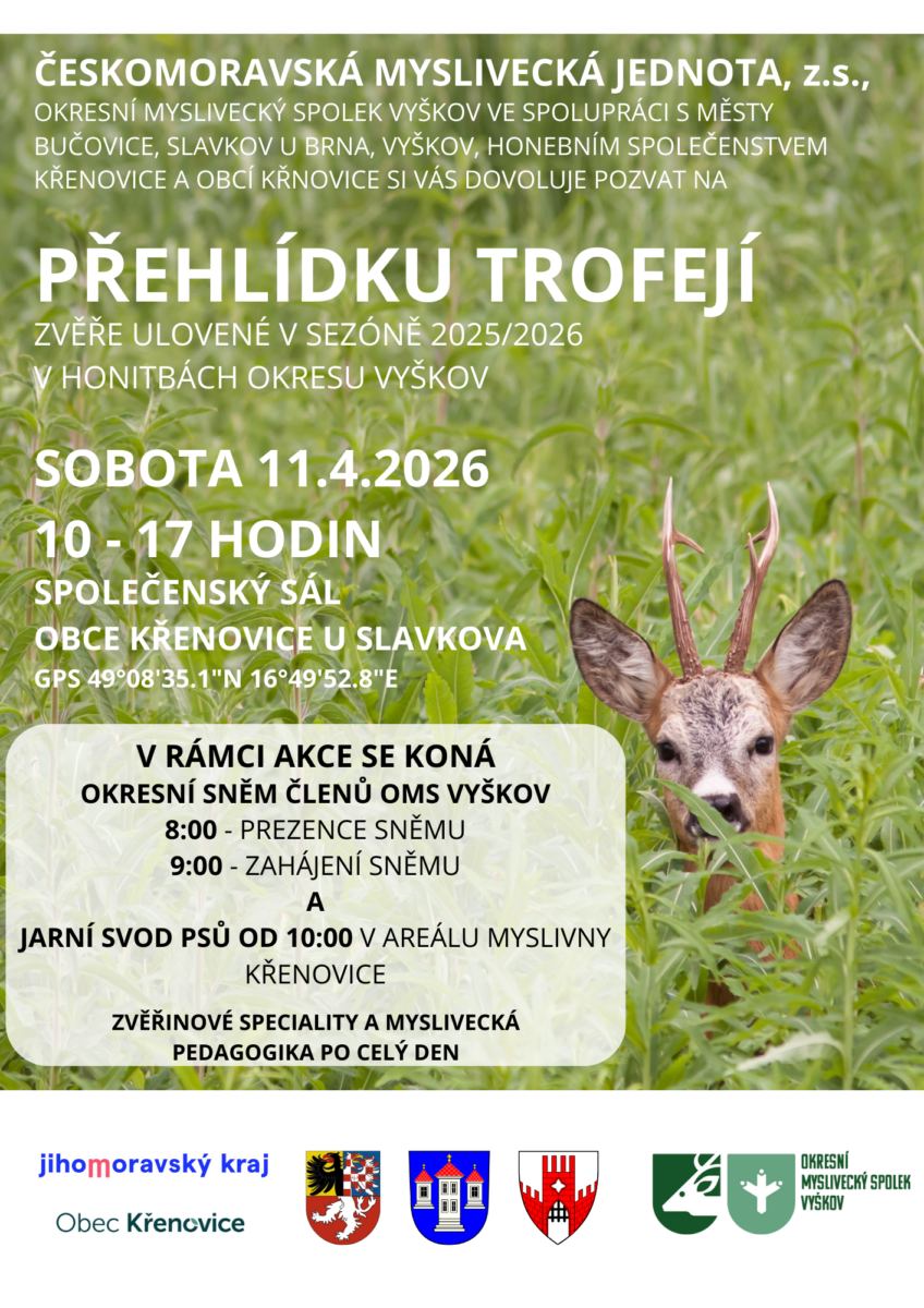 V sobotu 11. dubna 2026 se ve Společenském sálu v Křenovicích u Slavkova uskuteční sněm členů ČMMJ Okresního mysliveckého spolku Vyškov.